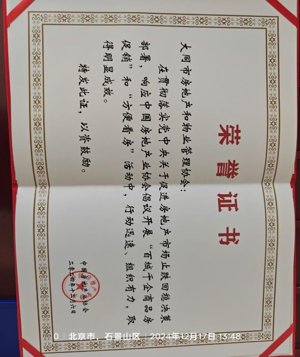 大同市房地產和物業管理協會由于在“百城千企商品房促銷”和“方便看房”兩項活動中表現突出受到中國房地產業協會表彰榮獲《百城千企商品房促銷活動》和《方便看房》優秀協會稱號。